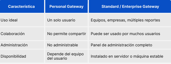 Las puertas de enlace son un componente esencial para conectar Power BI Service con datos locales. La decisión correcta depende totalmente del tipo de necesidades.