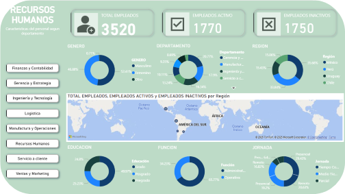 Un dashboard de RH necesita mostrar la salud interna de la organización. Un buen diseño comienza con una vista ejecutiva donde se presentan las métricas globales: número total de empleados, rotación mensual, ausentismo y nivel de satisfacción. Después, conviene incorporar visualizaciones que expliquen por qué cambian esos indicadores, como gráficos de barras que detallen los motivos de salida o los tiempos promedio de contratación por área.
