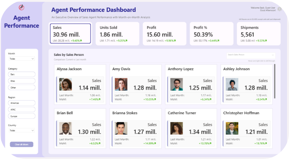 En el área comercial, el objetivo no es solo conocer cuánto se vendió, sino entender qué impulsa las ventas y qué las limita. Estos dashboard suelen iniciar con una vista ejecutiva donde se presentan los KPIs clave: total de ventas, porcentaje de cumplimiento de metas y ticket promedio.