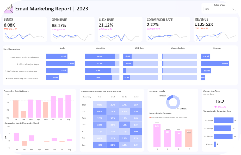 Una buena práctica es mantener coherencia de color entre canales (por ejemplo, azul para Facebook, rojo para YouTube, verde para Google Ads), facilitando la lectura rápida. Con ello, el dashboard no solo mide resultados, sino que traduce el impacto del marketing en términos de negocio.
