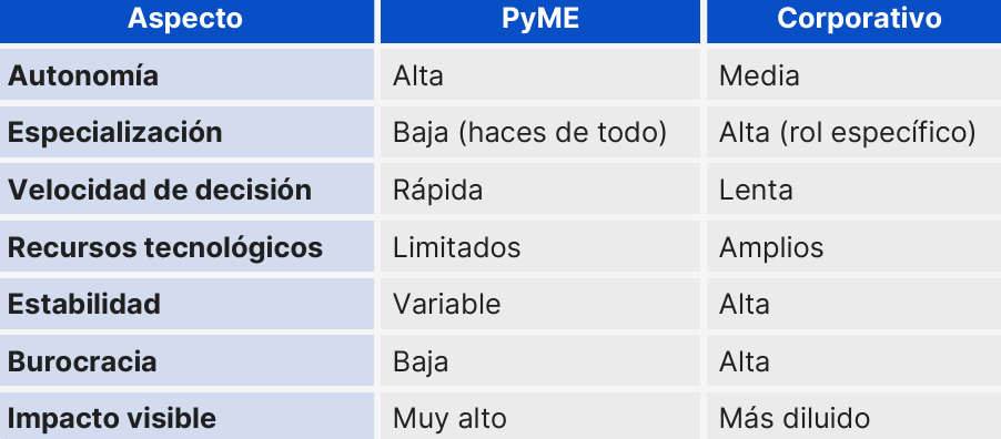 Principales diferencias para analistas en Pyme vs Corporativo