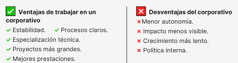 - Corporativo suele pagar mejor en niveles Jr y Mid.