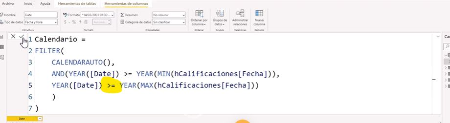 Tu lógica es correcta. Podría parecer que debería usarse <=, pero en este caso CALENDARAUTO() ya genera el calendario según las fechas del modelo, por lo que el filtro sigue funcionando correctamente dentro de ese contexto. 🙌