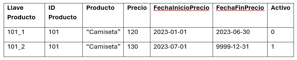 - Otra opción que es muy buena pero implica hacer cambios a la dimensión de productos, es que con cada cambio de precio crees una nueva versión del producto seguido por un numero sencuencial, como el caso de la columna de Llave de la siguiente imagen: