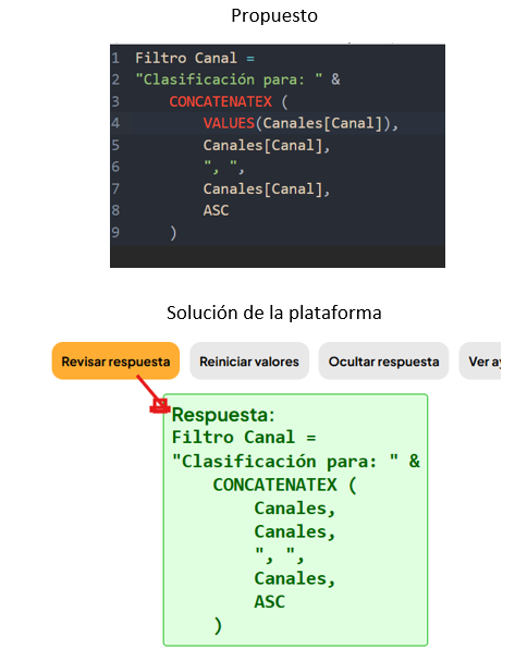 Hola Javier, En la solución de los ejercicios veo que consideras solo Canales, según la clase entiendo que no solo deberia ir Canales si no que deberia referenciarse a la columna Canal. Dejo mi solución propuesta, en todo caso indicame cual seria la solución, ya que aún poniendo la solución de la plataforma no lo válida. Propuesto (mi solución) y Solución de la plataforma (es lo que sale de revisar respuesta). image.png73.02 KBSaludos,