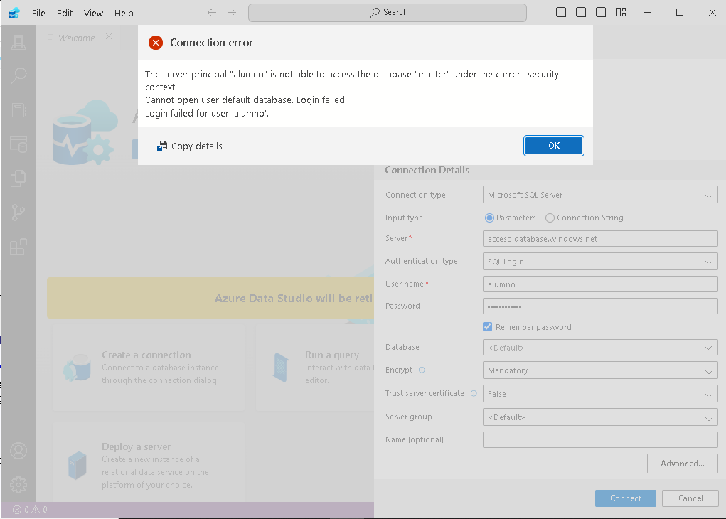 buenas tardes! no logre conectarme a la base de datos, no me aparece la base, queda en default y arroja este mensaje