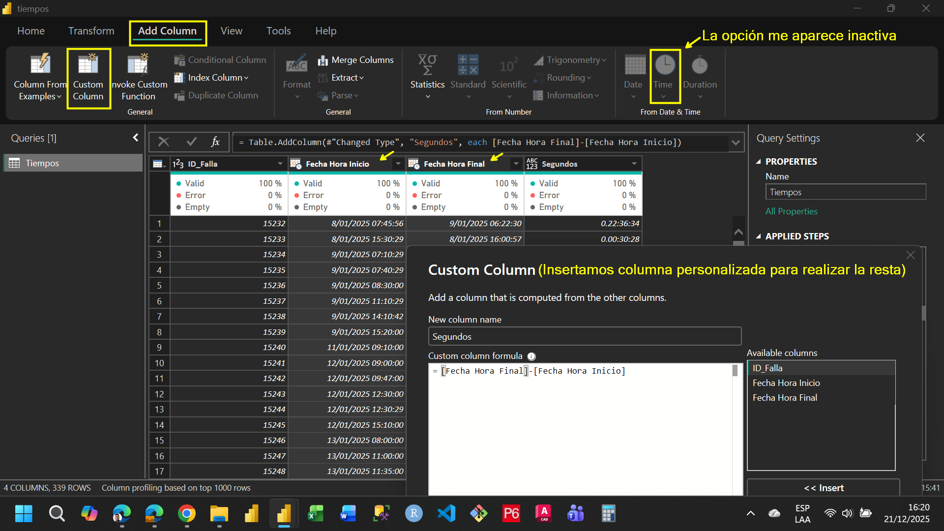 Al igual que a Camila, no me aparece activa la opción para realizar la resta. Sin embargo, en Power Query de Excel si pude realizar la operación con la opción "Hora" 🧐. En Power Bi, para poder solucionar inserté una columna personalizada y pude obterner la resta.