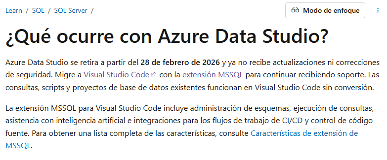 revisando la información del curso, Azure Data Studio ya no se actualiza, se retiró el 28-feb-2026.