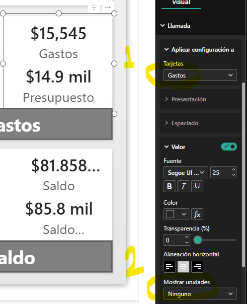 Hola Sarai, gracias, por lo de restaurar objetos visuales predeterminados: ok, ya pude tener acceso a la tarjeta que usaste en el ejemplo, sin embargo sigue sin aparecerme la opción donde quitar las unidades, me puedes ayudar por favor? Te comparto la captura de pantalla donde muestra que si está seleccionada la tarjeta, sin embargo no tengo la opción de unidades. Captura de pantalla 2026-04-01 175519.png32.77 KB