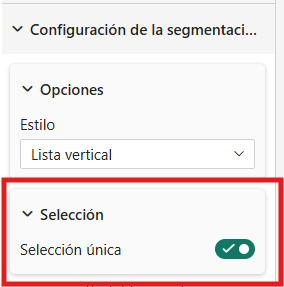Hola Yurian! Al seleccionar el segmentador, desde el panel de formato en el apartado de Configuración de la segmentación puedes seleccionar la opción de "Selección única".😊 image.png11.85 KB¡Saludos!