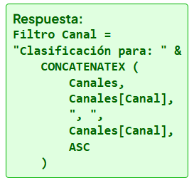 Hola Jordy, gracias por los comentarios. Por alguna razón la respuesta no te aparecen las referencias de la columna Canal: image.png14.75 KB Te comento que tu respuesta es correcta, aunque para este caso la tabla de Canales se considera que tiene valores distintos de Canal, y no es necesario ajustar la granularidad con VALUES.