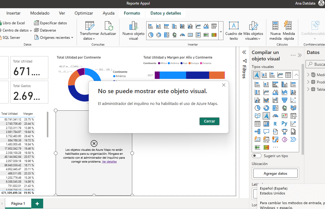 Hola buenas tardes, consulta podrían ayudar como habilitar el Mapa de Azure, ya que no me permite visualizar, muchas gracias. image.png49.48 KB Acabo de cambiar el mapa pero sale en blanco, ya active el mapa coroplético y reinicie Power BI, pero aún asi no puedo actualizar el mapa, pueden ayudarme. image.png204.26 KB