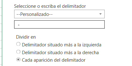 - Para tu caso, dado que parece que solo toma el primer valor y elimina el resto, podrías intentar la opción "Cada ocurrencia del delimitador". Si eso no funciona, prueba a eliminar los espacios alrededor del guion en tu delimitador de entrada (usar solo "-" y luego ajustar espacios si es necesario) o usar la opción de "dividir por delimitador personalizado" y asegurarte de que sea el guion con los espacios exactos.