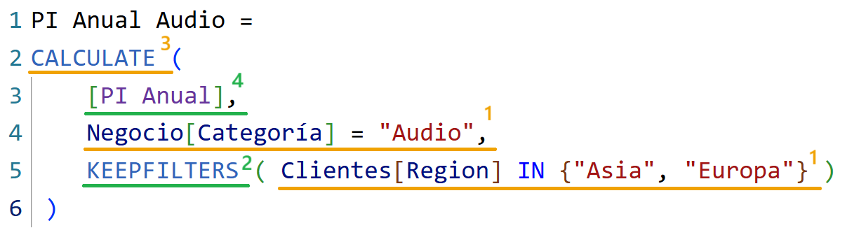 CALCULATE evalúa los argumentos de filtro, las condiciones Categoría = “Audio” y Clientes = {“Asia”, “Europa”}.