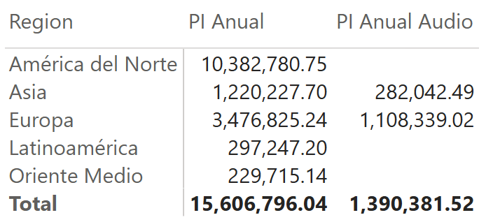 Se evalúa la expresión. La nueva medida, PI Anual Audio, muestra el Promedio de Ingresos Anual por Región para la categoría Audio, solo para las Regiones Asia y Europa. CALCULATE_03.png48.2 KB