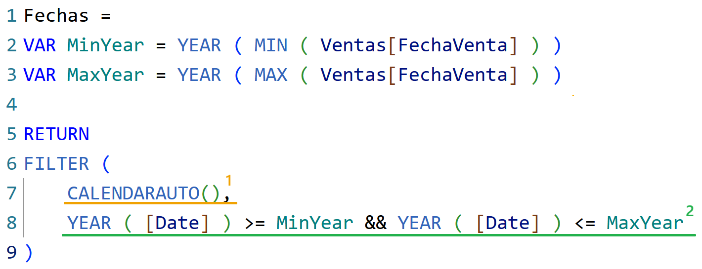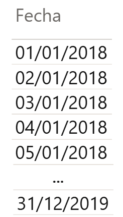 Función de fecha/hora que devuelve una tabla de una sola columna con todas las fechas en un intervalo calculado automáticamente en base a las fechas mínima y máxima encontradas en el modelo.