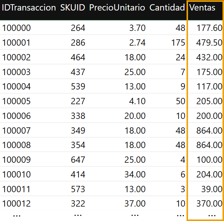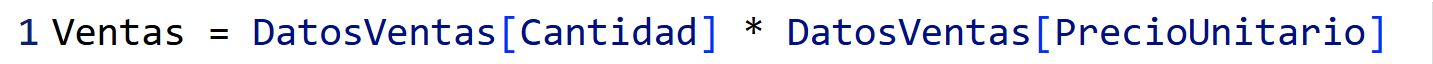 La fórmula genera una columna calculada, Ventas, que crea un registro para cada fila en base a las columnas Cantidad y PrecioUnitario, por ende, utiliza el contexto de fila. Fila_02.png84.15 KB