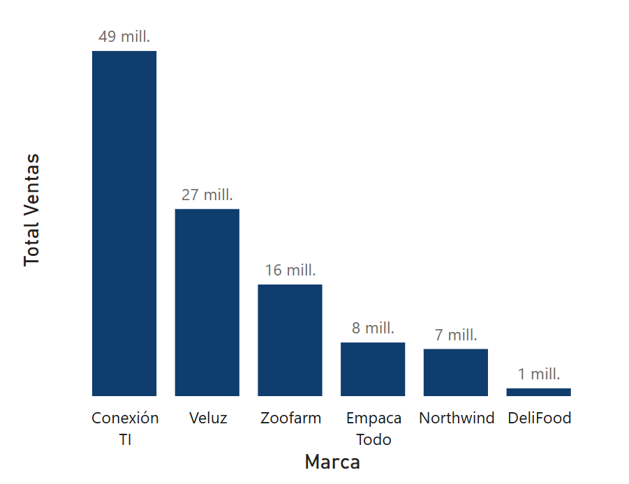 La fórmula calcula un valor dinámico, Total Ventas, que cambia en función del campo asignado en la visualización, Marca. La suma considera todos los registros de una marca (la cual representa una agrupación y cuyos puntos de datos conforman una tabla virtual) y produce un resultado por marca, por ende, utiliza el contexto de filtro. Filtro_02.png24.92 KB