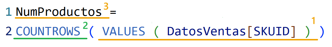 - COUNTROWS recibe la lista generada por VALUES y cuenta el número de filas en la tabla virtual.