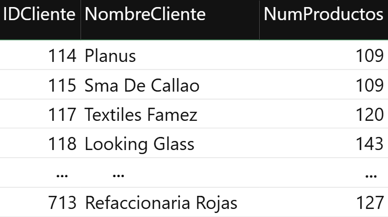 - El contexto de fila segmenta NumProductos por cliente, mostrando el número de productos distintos vendidos por cliente.