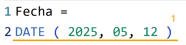 - DATE evalúa los argumentos de año, mes y día en orden para devolver la fecha correspondiente, 12 de mayo del 2025. La sintaxis dt“2025-05-12" produce el mismo resultado.