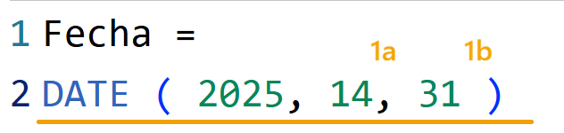 - DATE evalúa los argumentos en orden. Al encontrarse con un mes mayor a 12, le suma la diferencia de 2 meses al año siguiente, devolviendo febrero 2026 (a). De la misma manera, al encontrarse un número de días mayor a los del mes correspondiente (28), le suma la diferencia de 3 días al mes siguiente, devolviendo así la fecha, 03 de marzo del 2026 (b).