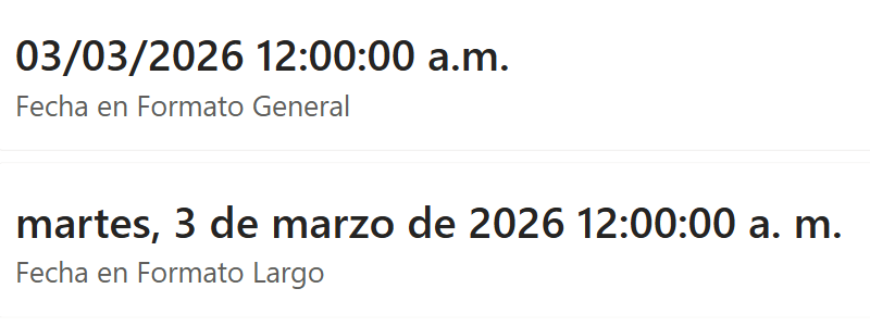 - <día>: el día de la fecha representado por un número del 1 al 31. Si se excede el número de días en un mes (28 a 31), se suma la diferencia al principio del mes siguiente.