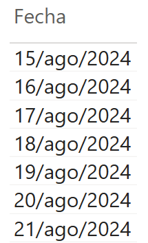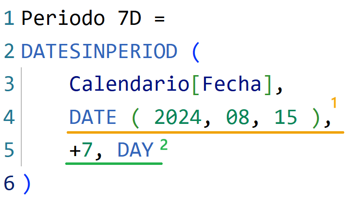 - DATESINPERIOD recibe la columna Fecha de la tabla Calendario y la fecha de inicio del intervalo (15/Ago/2024).