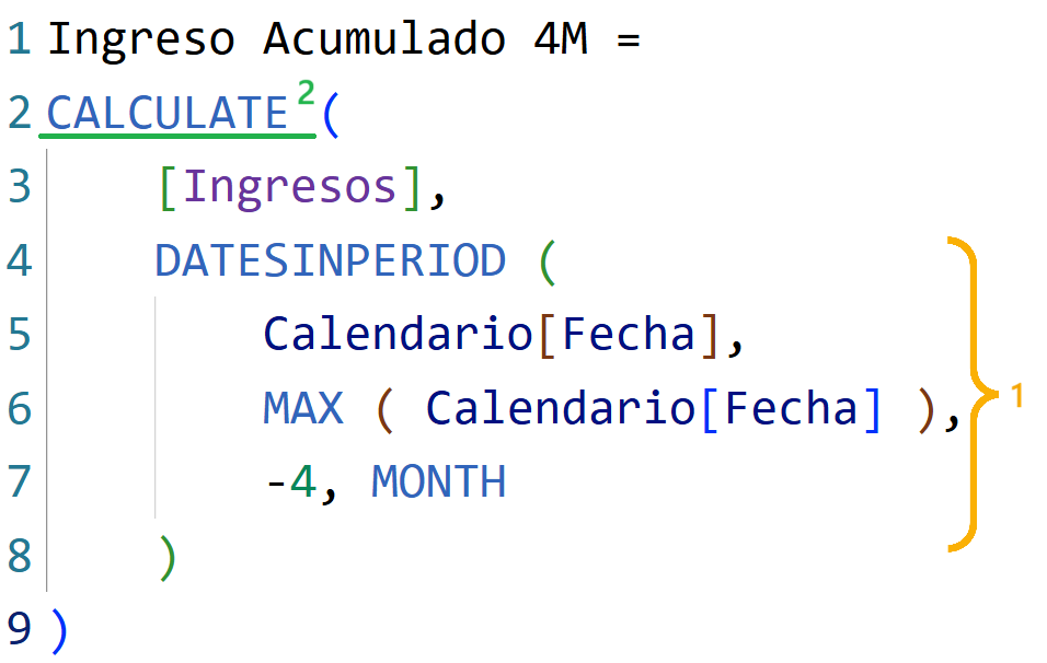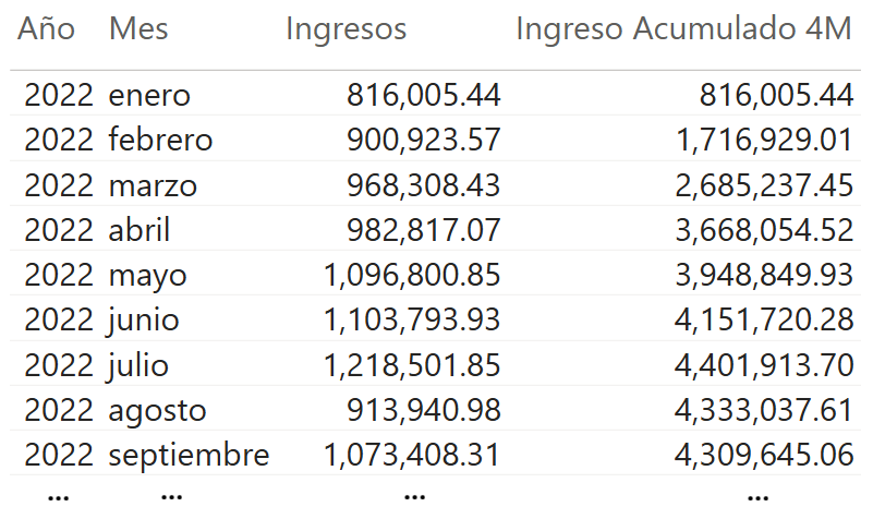 - CALCULATE calcula la medida Ingreso Acumulado 4M, la cual muestra el ingreso acumulado en los últimos 4 meses para cada mes en el contexto de filtro. Compárese con la medida Ingresos.