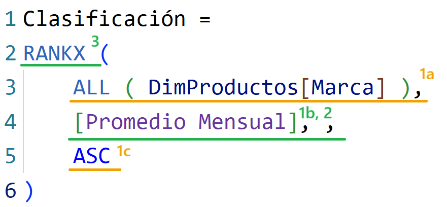 - La función recibe la tabla virtual generada por ALL, la cual asegura que se consideren todas las Marcas para la clasificación(a), y evalúa la medida Promedio Mensual dentro de un contexto de fila(b) para crear una tabla de búsqueda con los valores para la clasificación ordenada en orden ascendente por ASC(c).