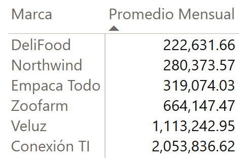 - RANKX busca el resultado de Promedio Mensual para cada Marca en la tabla de búsqueda y le asigna una clasificación de acuerdo con su posición.