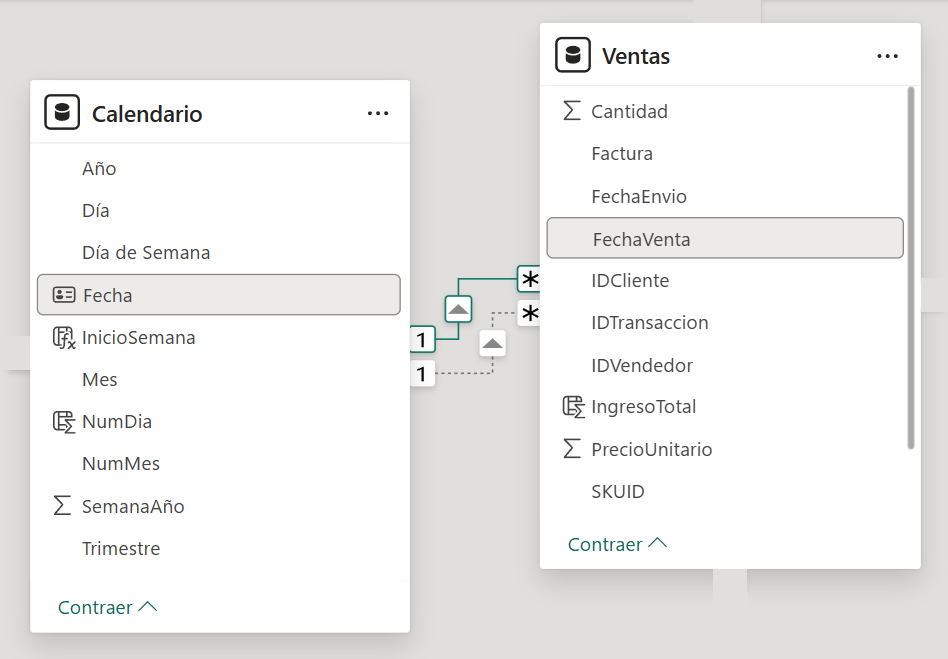 Partimos de la relación predeterminada activa en el modelo de datos, Fecha en Calendario y FechaVenta en Ventas. USERELATIONSHIP_00.png69.28 KB