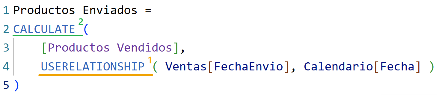 USERELATIONSHIP instruye a CALCULATE que active temporalmente la relación entre FechaEnvio en Ventas y Fecha en Calendario, desactivando la relación predeterminada.
